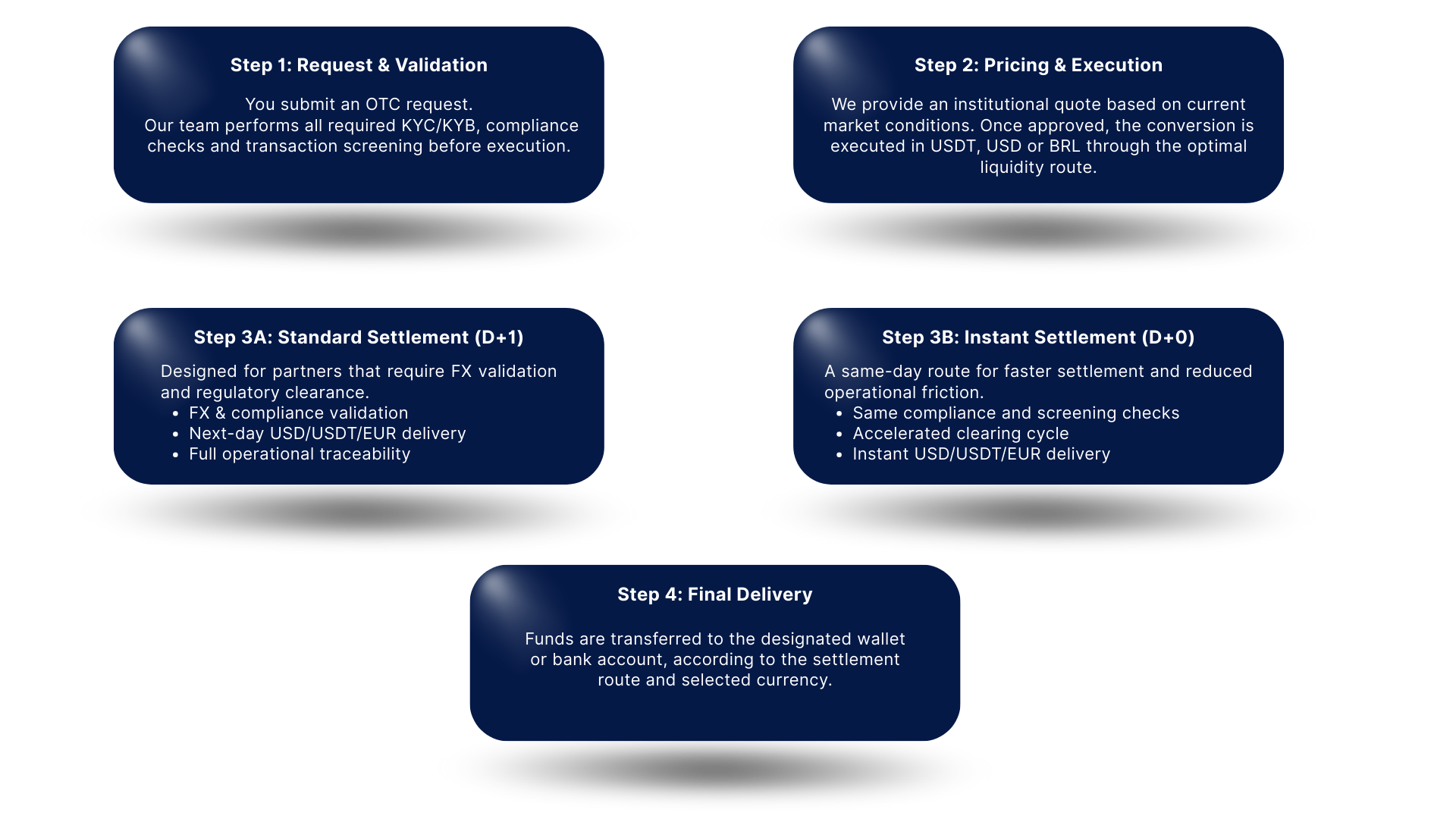 Cross-border OTC flows are executed through regulated international partners, providing robust USD/USDT/EUR settlement capabilities, FX validation, and full compliance alignment.